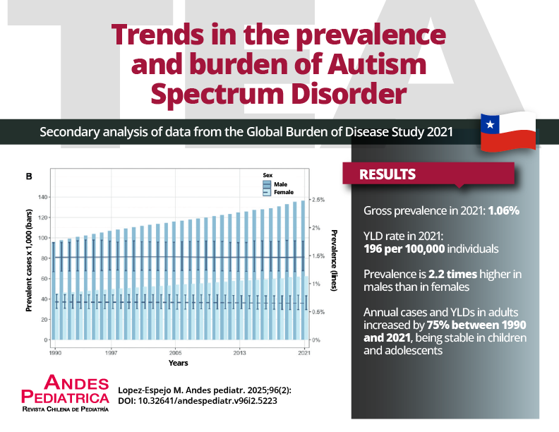 Conclusiones: La prevalencia de TEA en Chile el 2021 fue significativamente mayor en hombres que en mujeres, sin diferencias significativas por edad. Aunque la prevalencia general y específica por edad parece estable, el aumento de casos totales en adultos indica una creciente carga de TEA en Chile. Es necesaria investigación adicional para identificar factores subyacentes y abordar posibles barreras para el diagnóstico y acceso a la atención.