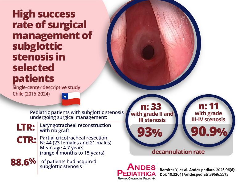 Pacientes y Método: Estudio retrospectivo de los resultados quirúrgicos y complicaciones post operatorias de 44 pacientes pediátricos con ESG tratados con RLT o resección cricotraqueal parcial (RCT) entre los años 2015 y 2024 en un hospital pediátrico terciario.