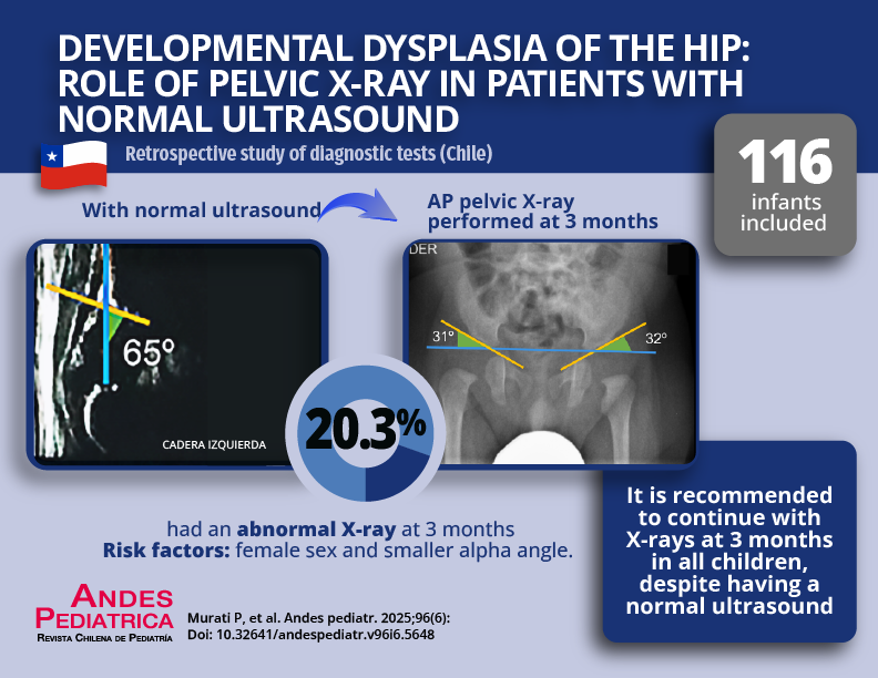 Pacientes y Método: Estudio retrospectivo de pruebas diagnósticas. Se incluyeron lactantes nacidos entre 2018 y 2021 con al menos un factor de riesgo para DDC, que tuvieran una ecografía de caderas normal realizada entre la 2.ª y 12.ª semana de vida, y que contaran con una radiografía de pelvis tomada desde el 3er mes. Se recolectaron datos demográficos, factores de riesgo, resultados ecográficos (ángulo alfa según clasificación de Graf) y radiográficos (índice acetabular medido a los 3 meses). Se analizaron los datos para identificar factores asociados a radiografías alteradas.