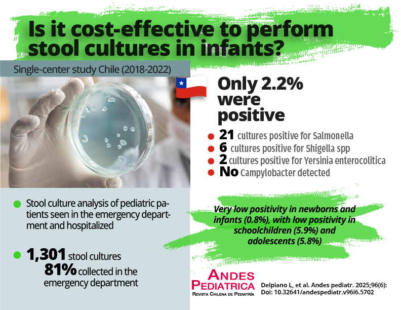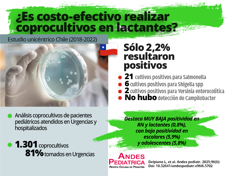 Pacientes y Método: Revisión de 5 años (2018 a 2022) evaluando la positividad de coprocultivos tomados a pacientes pediátricos en un servicio de urgencia pediátrico, y unidades de hospitalización de un hospital público, además de costos asociados al examen.