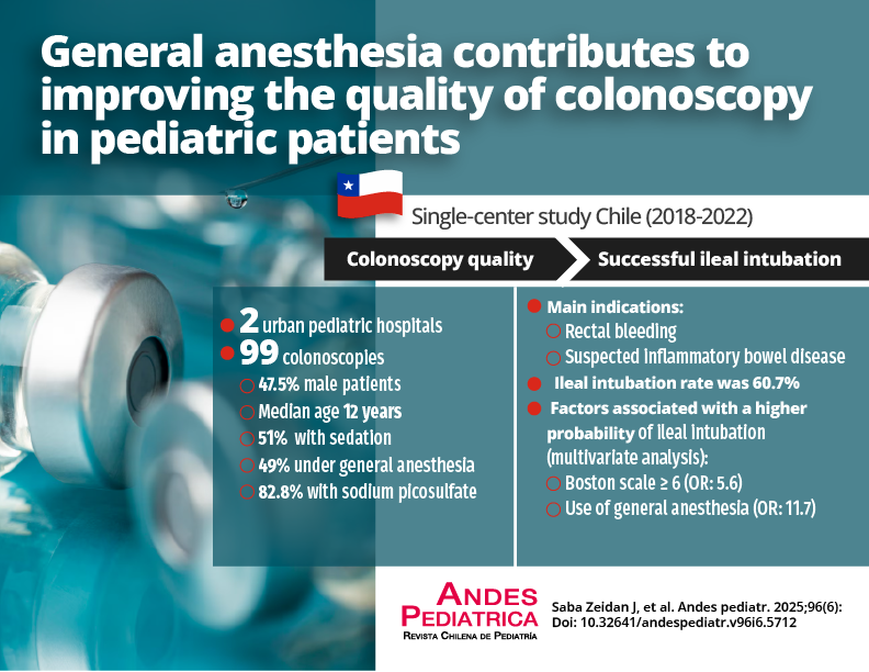 Results: A total of 99 colonoscopies performed at two pediatric hospitals in Santiago, Chile, were included. Of the patients, 47.5% were male, with a median age of 12 years. Sedation was used in 51% of procedures, while 49% were performed under general anesthesia. Sodium picosulfate was the most frequently used bowel preparation agent (82.8%). The main indications for colonoscopy were rectal bleeding and suspected or follow-up of inflammatory bowel disease. The overall ileal intubation rate was 60.6%; stratified by intervention type, it was 45.8% with sedation and 82.5% with general anesthesia. In multivariate analysis, a Boston scale score ≥ 6 (OR: 5.6) and the use of general anesthesia (OR: 11.7) were significantly associated with a higher likelihood of ileal intubation.