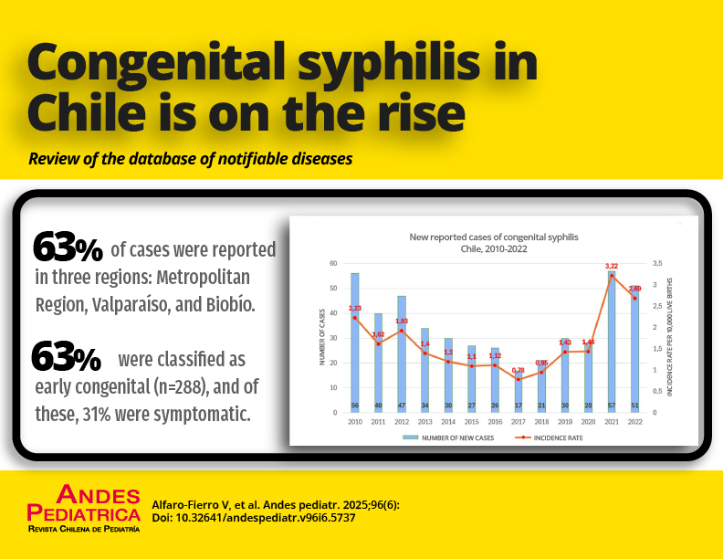 Resultados: Se notificaron 454 casos de sífilis congénita. La incidencia muestra una tendencia al incremento desde el 2018, siendo el 2021 el año con más notificaciones. El 63% de los casos se reportaron en tres regiones, Región Metropolitana, Valparaíso y Biobío. El 63% se clasificó como congénita precoz (n = 288) y de ellos el 31% fue sintomático.