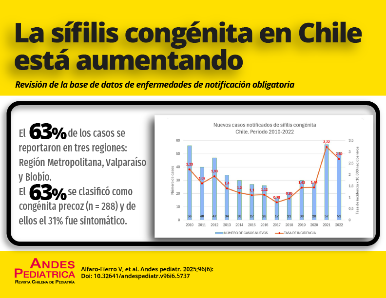 La sífilis congénita ocurre por transmisión transplacentaria del Treponema pallidum subspecies pallidum. A nivel mundial y en Chile se ha observado un aumento de casos de sífilis.